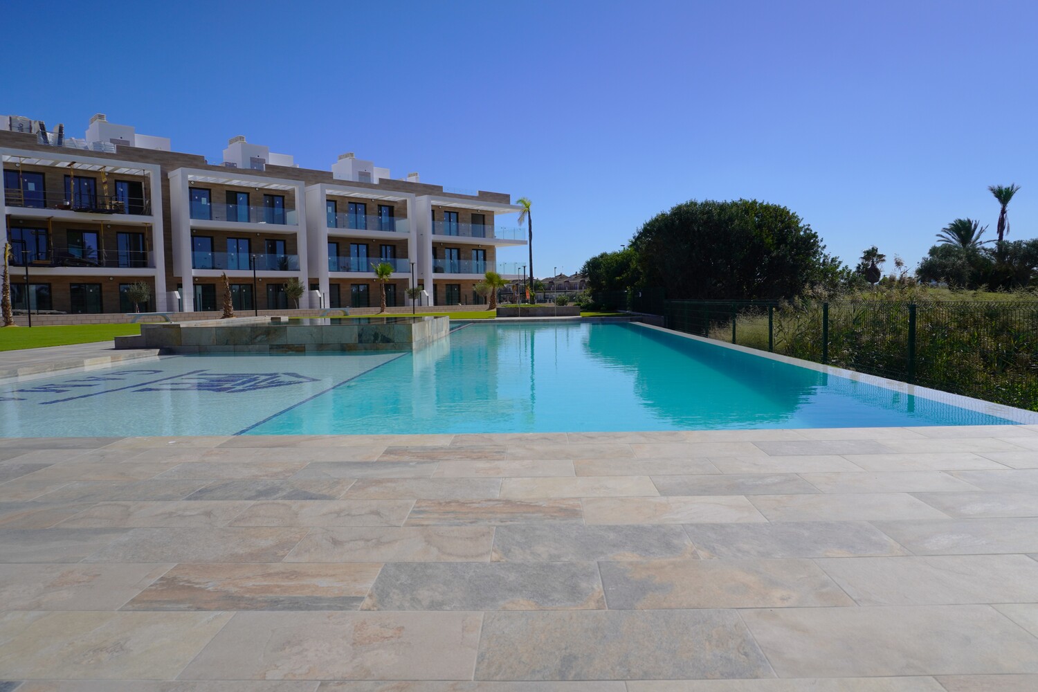 Toplocatie voor golf- en natuurliefhebbers, deze moderne Penthouses met een balkon van 18 m2 en een solarium van 56 m2 (Bij de 3 slaapkamers is het balkon 24 m2 en het solarium 68 m2). Voorzien van 2 of 3 slaapkamers en 2 badkamers waarvan 1 badkamer en suite. Door de gevelbekleding met houtnerftegels heeft het geheel een luxe uitstraling. De woningen met een bebouwd oppervlak van respectievelijk 88 m2 en 105 m2, afhankelijk van het aantal slaapkamers, bevinden zich op slechts 1 km van de zee en zijn geschikt voor zowel permanente bewoning als verhuur. Ze worden opgeleverd inclusief een parkeerplaats in de ondergrondse parkeergarage met 5-7 m2 berging voor oa fietsen. De parkeergarage is bereikbaar met de lift. De erg mooi aangelegde gemeenschappelijke ruimte met veel groen heeft 2 zwembaden waarvan het infinity zwembad prachtig zicht heeft over het golfresort. Naast het zwembad zijn toiletten en er is een ruimte met kinderspeeltoestellen.