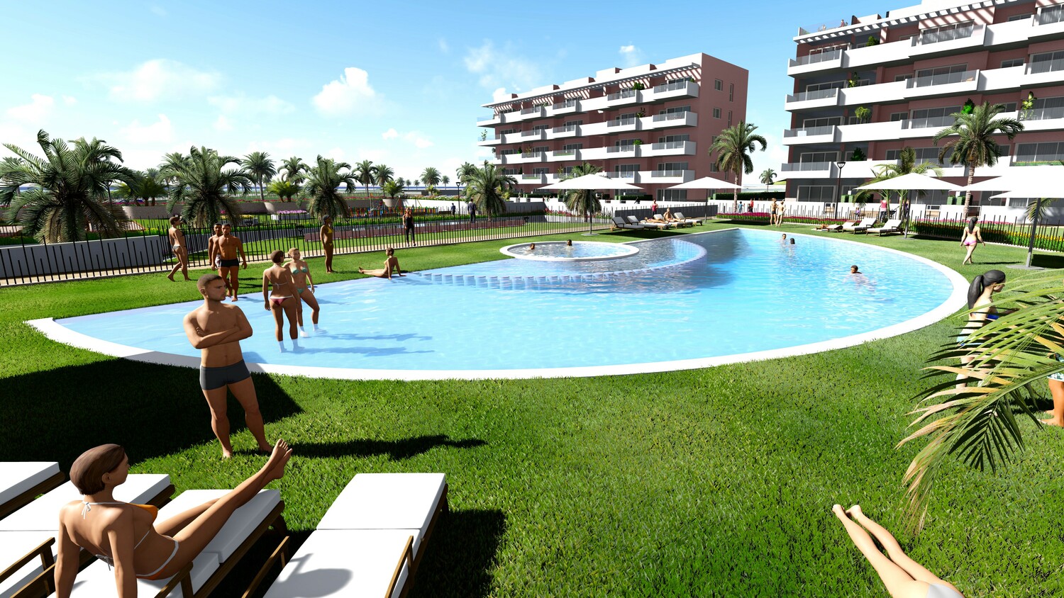 Deze begane grond appartementen, met Cotegran stucwerk, van 106 m2 (75 m2 exclusief de 2 terrasoverkappingen) met 3 slaapkamers en 2 badkamers waarvan 1 en suite. De woningen kunnen in 2 verschillende interieurs worden uitgevoerd. Zo is er de keuze uit een lichte beige vloer met houten binnendeuren, kasten en kozijnen. De 2e optie is een uitvoering in wit voor de binnendeuren, kasten en kozijnen. De tegelvloer bij de 2e optie is lichtgrijs. Het betegelde terras heeft een oppervlak van 42 – 333 m2. De woningen zijn voorzien van een privé parkeerplaats in de ondergrondse parkeergarage. Aan de gemeenschappelijke ruimte is veel aandacht besteed met een erg mooi zwembad in de vorm van een halve cirkel waaronder het binnenzwembad is gecreëerd met een Spa welke de cirkel als het ware rond maakt. Vanuit het binnenzwembad is er mooi uitzicht op de gemeenschappelijke tuin met hoge palmbomen en andere beplanting. Naast het zwembad is er ook een jacuzzi, minigolf en er staan gymtoestellen.